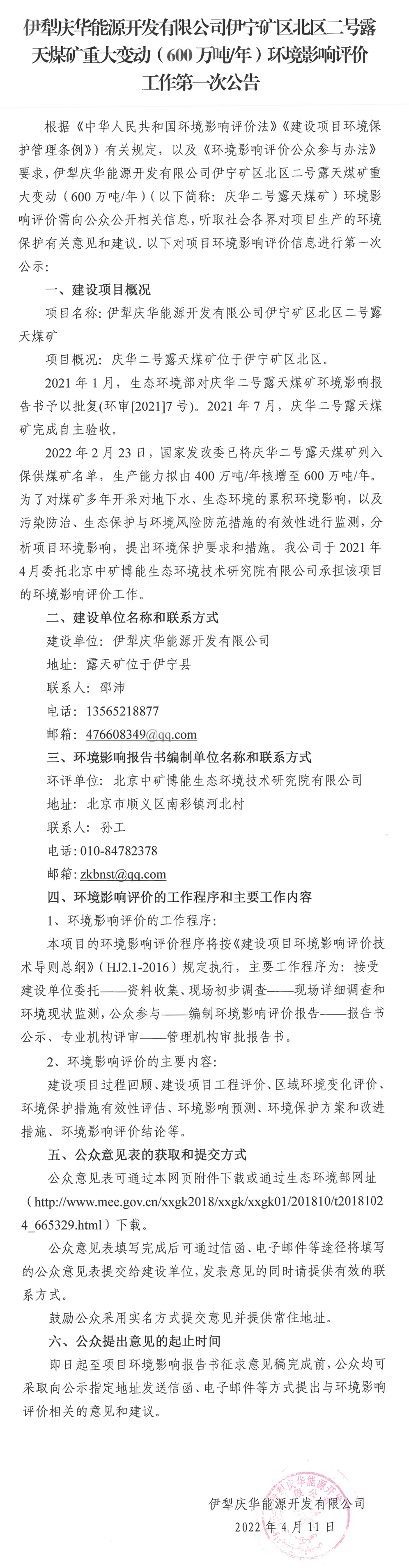 伊犁慶華能源開發(fā)有限公司伊寧礦區(qū)北區(qū)二號露天煤礦重大變動(600萬噸/年)環(huán)境影響評價工作第一次公告