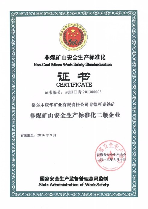 中國慶華青海消息(徐芳)近日,格爾木礦業(yè)公司肯德可克鐵礦獲得了青海省安全生產(chǎn)協(xié)會頒發(fā)的非煤礦山安全生產(chǎn)標準化證書和“非煤礦山安全生產(chǎn)標準化二級企業(yè)”稱號。