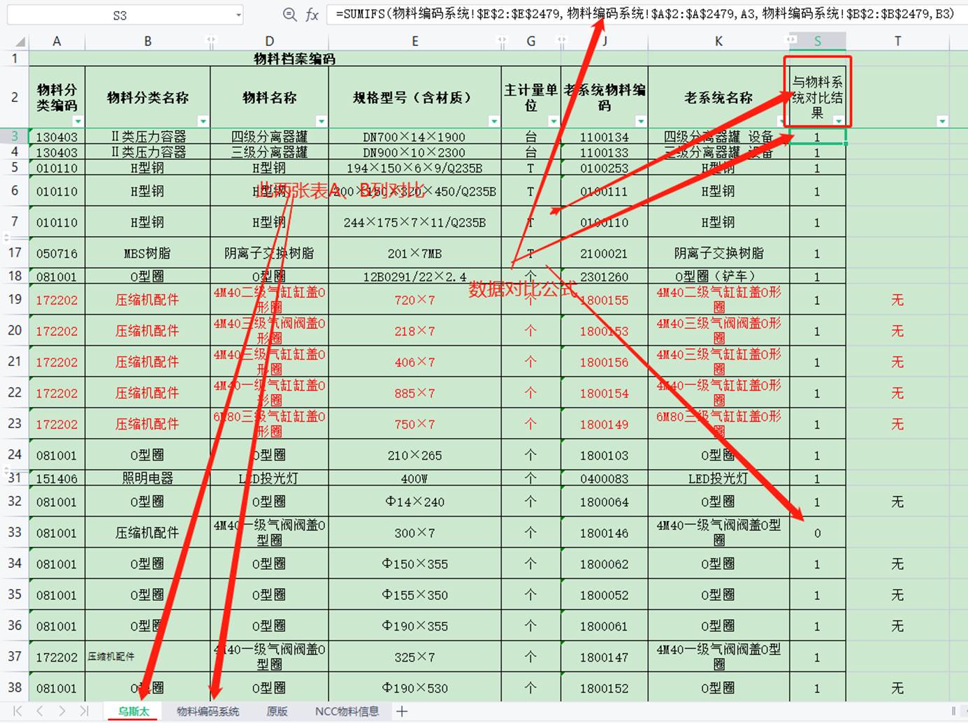 S列值為1,說明其物料編碼及分類名稱符合規(guī)定,為零則說明與規(guī)定存在差異(本例中烏斯太S33為0,是由于壓縮機配件分類編碼是錯誤的)。