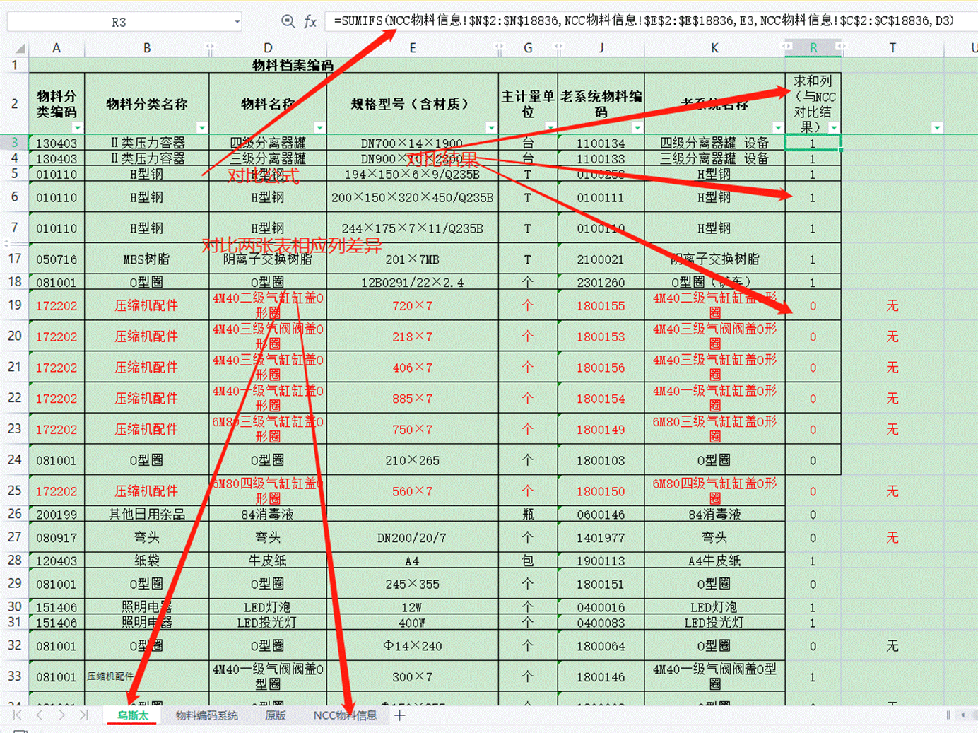 例2:8月,我們將部分公司物料基礎信息導入到了NCC系統(tǒng),但對于導入的錯誤直接在NCC系統(tǒng)修改而未能同步更正導入模板數(shù)據(jù),且部分公司在導入本公司基礎數(shù)據(jù)后又進行了修改,因此NCC系統(tǒng)與各公司修改的物料信息存在差異。我們利用SUMIFS求和函數(shù)轉(zhuǎn)換成查找差異公式。